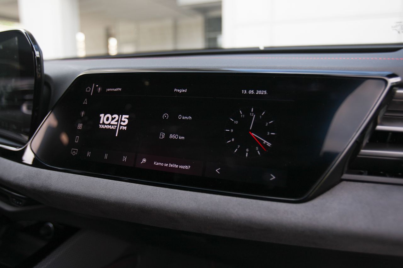 Takav je i u interijeru kojim, kako nalaže ‘Zeitgeist’, dominiraju ogromni zasloni – 11,9-inčni za vozača, 14,5-inčni dodirni za MMI-infotainment te opcijski 10,9-inčni dodirni za suvozača. Prva dva tvore svojevrstan panoramski zaslon koji izgleda i funkcionira izvrsno, osobito jer je najnovija generacija MMI-infotainmenta vrlo brza, responzivna i jednostavna za korištenje (ipak, srećom, tu su i bežični Apple CarPlay i Android Auto). S druge strane, poput rješenja za problem koji ne postoji, suvozačev zaslon djeluje pomalo besmisleno – omogućuje upravljanje samo nekolicinom funkcija, a nijednom osobito korisnom.