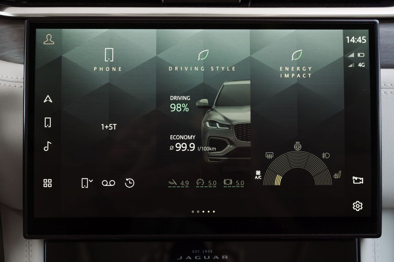 Iskorak je učinjen i tehnologijom – pored 12,3-inčnih digitalnih instrumenata, interijerom dominira 11,4-inčni visokorezolucijski zaslon novog infotainmenta Pivi Pro. Oblikom i veličinom nalik na tablet i pojednostavljen jasnim i intuitivnim izbornicima, sustav je responzivan i pun korisnih funkcija. Kao i prije, F-Pace je i korisno prostran – straga ima ugodno puno prostora i za dulja putovanja (čak i uz opcijski panoramski krov), a prtljažnik ima volumen od 755 litara.