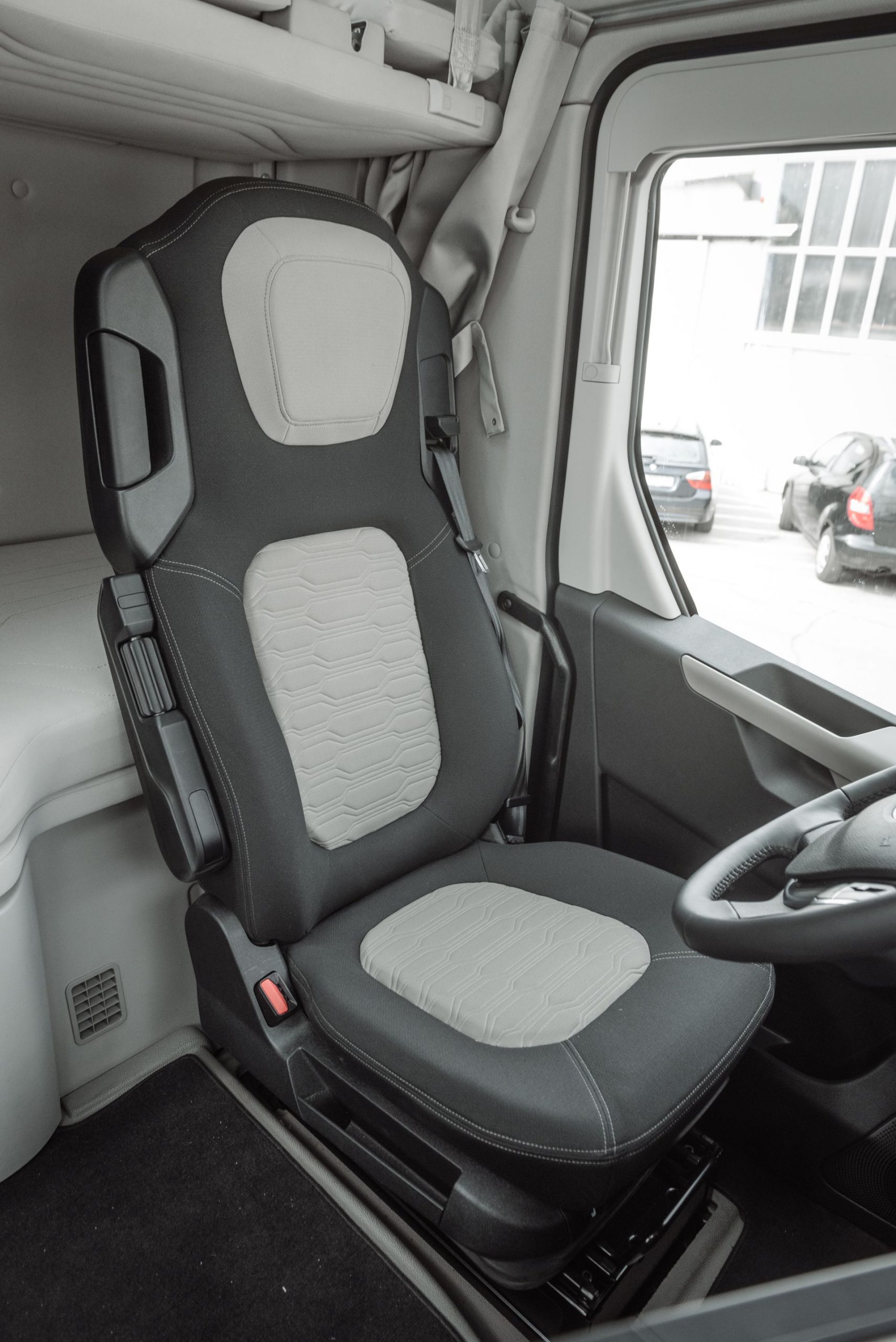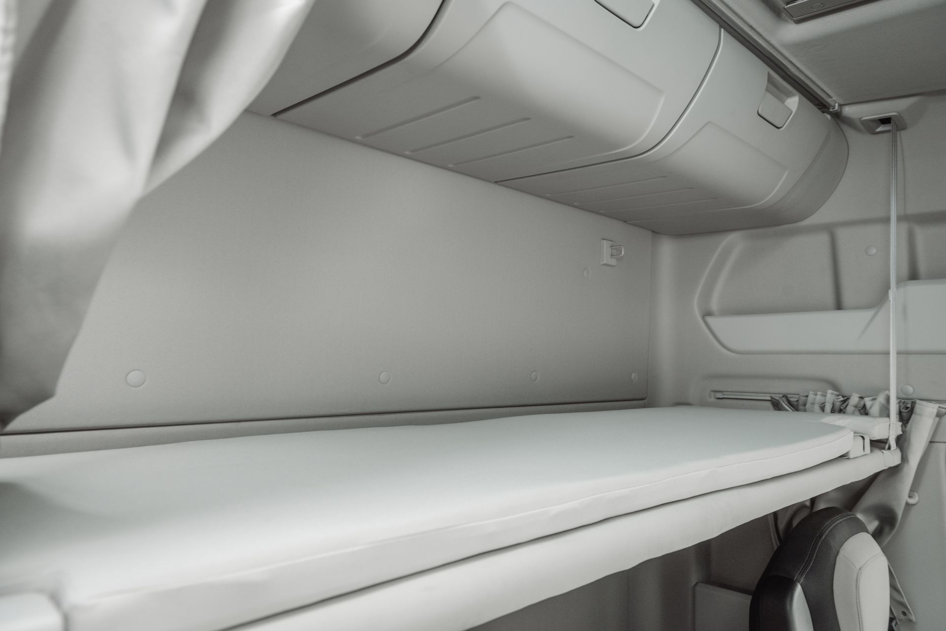 Spavaća kabina s povišenim krovom, D x Š 2316 x 2521 mm, unutarnja visina 2160 mm (iznad tunela 2070 mm), visina tunela 90 mm, tri stepenice 390 /390/372 mm, visina 1410 mm, dva sjedala sa zračnim ovjesom i ugađanjem visine, nagiba naslona, nagiba i duljine sjedeće površine, grijanjem i lumbalnom potporom u četiri razine, dva ležaja duljine 2100/1900 mm i širine 700-800 mm, tri zatvorena i jedan otvoreni pretinac iznad vjetrobrana, dodatni pretinci na stražnjoj stijeni, komandnoj ploči i ispod kreveta, hladnjak 38 litara, dva vanjska pretinca dostupna iz unutrašnjosti, automatski klima-uređaj, stacionarni grijač, dvostruki bočni retrovizori s grijanjem i električnim ugađanjem (samo glavni), električno pokretani prozori, zračni ovjes kabine u četiri točke, električno podizanje