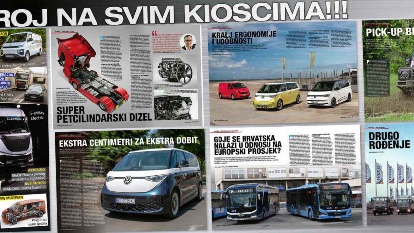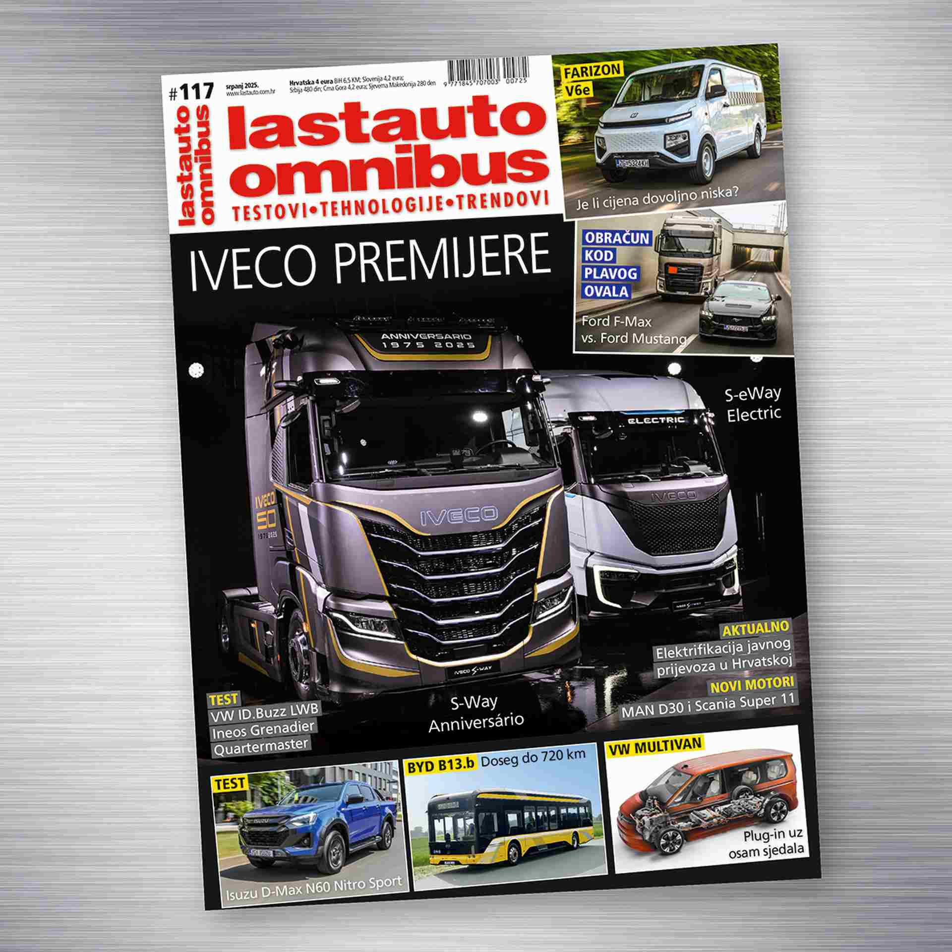 U novom broju (117) magazina lastauto omnibus predstavljamo dva noviteta s Iveco slavlja u Torinu gdje su u sklopu obilježavanja 50 godina tvrtke zvijezde večeri bili novi električni tegljač S-eWay, limitirana izvedba S-Way Aniversário te dva električna transportera na bazi Stellantisa. U jedinstvenoj priči donosimo neobičan susret dva junaka s logom plavog ovala - dizelski Ford F-Max 500 i benzinski Ford Mustang V8 GT. Gospodarski i sportski svijet imaju puno toga zajedničkog. Usprkos inflacije baterijsko-električnih modela, proizvođači neprestano usavršavaju, a neki čak i predstavljaju nove klasične dizelske motore. Predstavljamo MAN PowerLion D30 u kombinaciji s obnovljenim mjenjačem MAN TipMatic 14 te Scanijin dizel s jedanaest litara obujma i pet cilindara. U vjetrovitom i, za ovu priliku, sunčanom Amsterdamu imali smo iz prve ruke upoznati najnoviju Volkswagen gospodarsku gamu, s naglaskom na VW Multivan eHybrid koji stiže s novog generacijom pogona, većom baterijom, ali i pogonom na sve kotače. Sve brojniji kineski proizvođači na našim prometnicama rezultirali su i testom modela Farizon V6E kojem je najveći adut - cijena. Za 19.990 eura + PDV su dostupni neki lagerski modeli, a mi smo provjerili što dobivate za te novce. Prvim testom smo obilježili i povratak cijenjenog pick-upa Isuzu D-Max u novoj generaciji, ali i upoznali, po svim pitanjima, beskompromisni Ineos Grenadier Quartermaster. Veliki test produženog VW ID.Buzza Pro LWB otkriva što donose dodatni centimetri između osovina i koliko se može prijeći s baterijom kapaciteta 86 kWh. MAN TGE dolazi s novim karoserijskim varijantama, a provjerili smo i gdje se Hrvatska nalazi u odnosu na europski prosjek kada je u pitanju elektrifikacija javnog prijevoza. Zanimljiv model je predstavio i kineski BYD s poluniskopodnim regionalnom varijantom električnog autobusa. Broj završavamo s aktualnim informacijama iz Europskog prvenstava utrka kamiona kao i tradicionalnom pričom iz povijesti. Ovog puta je to drugi dio priče o povijesti marke Iveco. Uživajte u sadržaju!