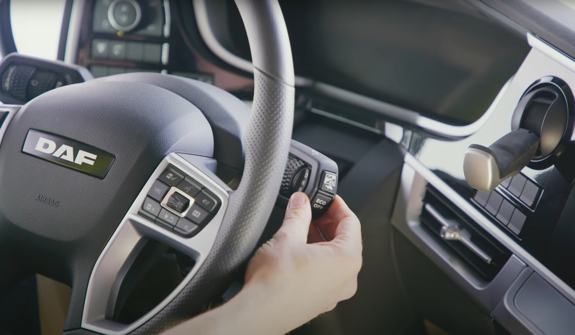 S armature su uklonjene i komande automatskog mjenjača pa klasična slova D, N i R sada nalazimo s desne strane upravljača na okretnom gumbu postavljenom na vrh čvrsto fiksirane ručice. I dodatne komande kao što je primjerice uključivanje moda za manevriranje nalazimo na vrhu spomenute ručice dok su manualne izmjene stupnjeva u okviru funkcija automatika uvijek rado viđena opcija kod vozača. Pozitivno je što primjerice Kick-down funkcija, uz naravno isključeni mod Eco, kod automatika djeluje znatno žustrije nego prije, a nova se generacija sada može istovremeno pohvaliti činjenicom da je spremna „riskirati“ 2 do 3 km/h više brzine iznad postavljenih ograničenja (Setpoint). On u što se DAF još ne upliće su funkcije poput otpuštanja gasa na uzbrdicama, stop-an-go pomoći u gužvama ili Pulse-and-glide. Mod za ranžiranje uključuje se pritiskom gumba A/M, ali samo u mirovanju gdje se ponovo isključuje iako vjerojatno postoje i komfornija rješenja.