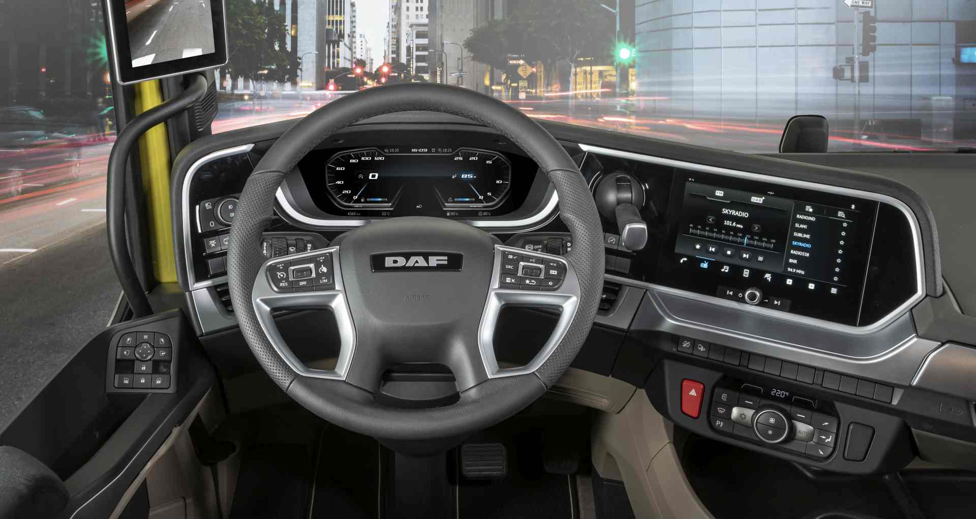 S desne strane kokpita, jednako elegantan u crno-bijeloj optici nalazi se još jedan zaslon s 12-inčnom dijagonalom koji ovdje preuzima ulogu infotainmenta. Njegovo područje rada uz spomenutu multimediju su dodatne informacije i upozorenja koji dolaze u ukupno četiri nivoa opreme. Kod svih funkcija važnih za vožnju kao što su reduktori, PTO-izvodi ili prilagođavanja zračnog ovjesa za vožnju DAF daje prednost klasičnim prekidačima umjesto petljanja putem digitalije. Pri tom je predviđeno maksimalno dvanaest mjesta za njih, a raspoređeni su vodoravno ispod infotaimenta odnosno iznad komandi klimatizacije. Potonja je istovremeno pomaknuta još malo više na desno nego prije pa nije više u izravnom vidokrugu vozača. Također treba napomenuti kako je samo admiralski brod XG+ dostupan s potpuno integriranog stacionarnom klimom. XG baš kao i XF se moraju kao i prije pouzdati u rješenja s vanjskim jedinicama no sigurni smo kako će i za njih DAF u dogledno vrijeme ponuditi mogućnost integracije.