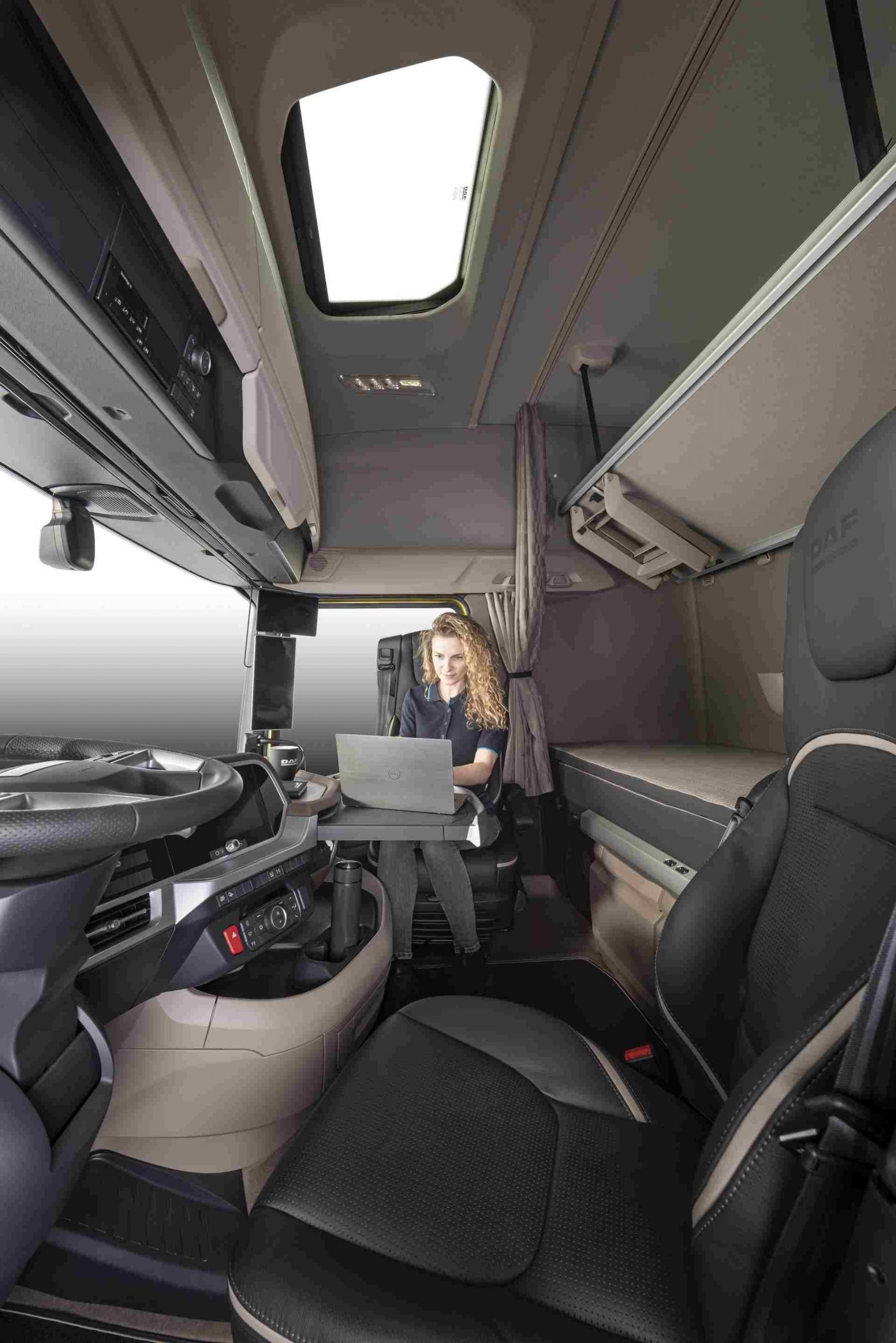 Etažu iznad na središnjoj armaturi nalazimo stolić na izvlačenje koji djeluje vrlo stabilno u svom konačnom položaju. Naravno, i njegove su dimenzije sukladno novim mjerama kabine povećane, a zajedno sa serijskim suvozačkim zakretnim sjedalom omogućava da opuštanje u trenutcima odmora bude uistinu komforno. Prema želji, a riječ je o novosti u kamionskom programu, DAF isporučuje i zakretno vozačko sjedalo za potpunu simetriju. Junačkih 2130 milimetara slobodnog prostora nalazimo između tunela motora i krova dok je 2060 mm stajaće visine na raspolaganju ispred samih sjedala. Time je lakše zanemariti da je prednji kraj kabine, kao uostalom i kod Scanije, blago zakošen prema nazad. Sve je to u skladu s potrebama za boljom vidljivošću prema vani odnosno optimizacijom aerodinamike koje su u DAF-u prema novim EU-regulama morali napraviti sada kada je dopušteno produžavanje kabine.