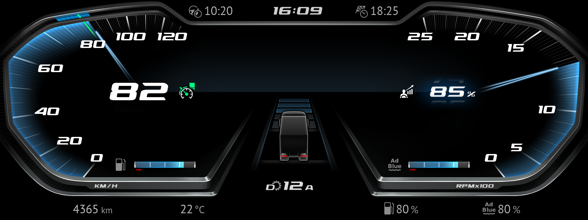 Sigurno je nakon prve vožnje još nešto – buka koja se stvara u području A-nosača sada je iznimno dobro prigušena. Zapravo, vrije općenito da je testni XG+ 530 u vožnji iznimno tih, barem dok pred njim nisu usponi. Vozačko radno mjesto pri tom nudi novi izgled, djelomično digitaliziran i s primarnim i sekundarnim zaslonom u klasičnom sjajnom crnom (piano) laku. Bijele brojke i oznake ističu se na duboko crnoj podlozi u armaturu uvučenih 12-inčnih digitalnih instrumenata. Raspodjela je pri tom klasična, brzinomjer s lijeva, okretomjer s desna, iako nije zadržan klasični polukružni oblik U konačnici je ova retro-futuristička kombinacija ipak dovoljno dopadljiva i, važnije, jasno pregledna. Kao i kod MAN-a igla brzinomjera se pokreće u smjeru kazaljki na satu, ona okretomjera u suprotnu stranu. Varijante prikaza instrumenata pored moda „Classic“ nude i „Modern“ gdje se uz 3D stupce za brzinu i okretaja nalazi i digitalni pokazivač brzine. Na kraju tu je i takozvani noćni mod gdje su svi pokazatelji radikalno minimalizirani kako bi što manje naprezali oči vozača, ali i radili odbljesak na bočnim prozorima.