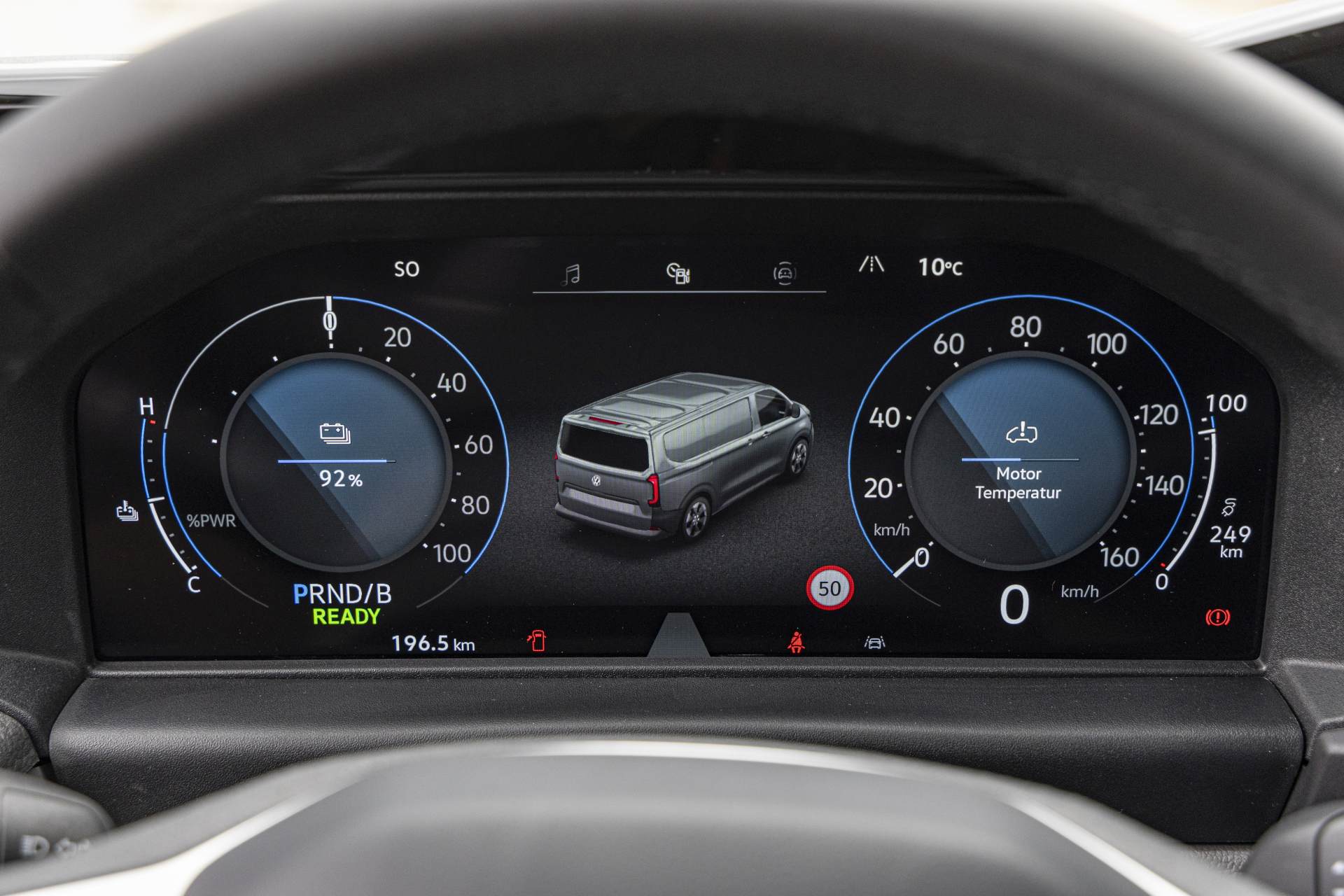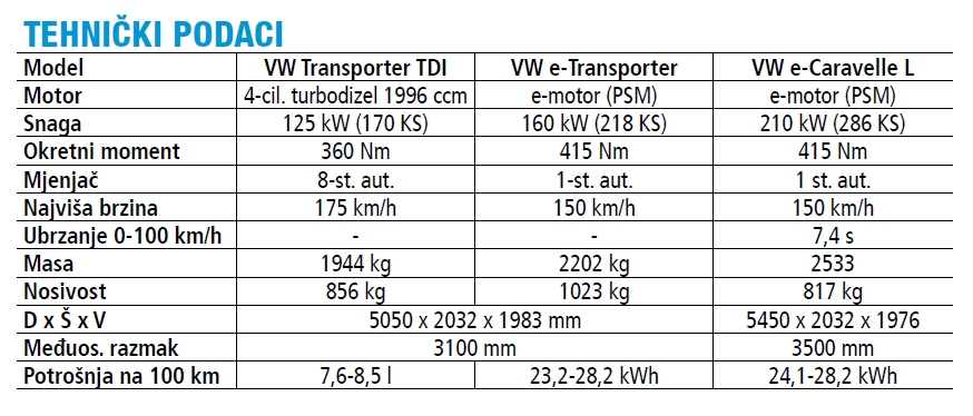 U vožnji je e-model vrlo tih pa do izražaja pomalo dolazi buka koju generira stražnja osovina. S ubrzanjem od samo 8,6 s do 100 km/h i maksimumom na 150 km/h VW dokazuje da e-mobilnost može biti vrlo zabavna iako je 160 kW (218 KS) pomalo zatomljeno. Potonje će još više doći do izražaja kada iz crvenog elektro furgona pređemo u najsnažniju putničku e-Caravellu plave boje čijih 210 kW (286 KS) i 7,4 s do sto obećava puno. No u praksi to nije bilo tako jer je testni primjerak bio opremljen inteligentnim limitatorom ubrzanja (54 eura) koji sprječava da ptrljaga i sitnice letaju po kabini. Prednost je svakako što je tako lakše doći do 311 km dosega (357 km kod e-transportera) prema WLTP-mjerenjima, ali iskreno nema puno razloga za odabir tako snažne varijante. Zato oprez kod konfiguriranja. Nešto izraženija bi mogla biti i snaga rekuperacije kod koje se malo toga mijenja kada se iz normalnog moda prebaci u “B” koji bi trebao snažnije usporavati e-Transporter. S druge strane kombinacija Fordove multimedije i VW stila laka je za korištenje i ugodna oku. Pozicija sjedenja je dobra, sjedala udobna iako ne nude previše bočne potpore no i oni viši će naći mjesta za koljena. Vozači će sigurno cijeniti čvrste gumbe na multifunkcionalnom upravljaču, ali i nešto manje način na koji preko zaslona moraju regulirati temperaturu.