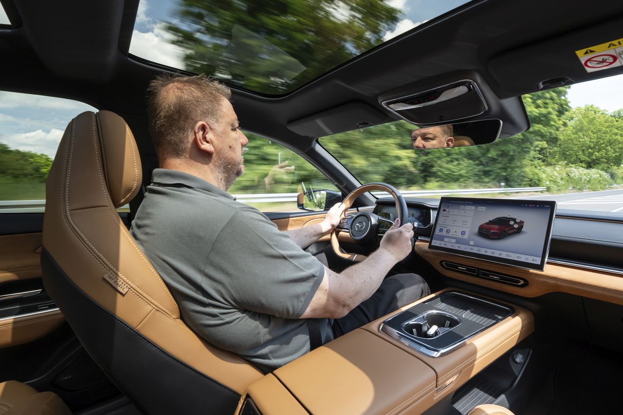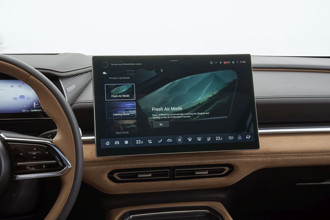 S putovnicom Narodne Republike fokus je isključivo na elektropogonu (stoga i dodatak 6e u imenu), dok je unutrašnjost još i više od nove Mazde CX-5 lišena fizičkih gumbi. Kvake na uvlačenje i prozori bez okvira su tu da dodatno naglase kupe linije impozantne, 4,92 metra duge limuzine. Prepoznatljiva skulpturalnost Kodo dizajna bez sumnje je prisutna, no kod proporcija kao da sjeda sve na svoje mjesto što sigurno i dio osobne percepcije. Uz 1,89 m širine te 1,48 m širine, nova je Mazda 6e u svim pogledima raskošnija od prethodnice te razumljivo teža, iako su dvije tone mase za ovu veličinu više no prihvatljive. Mjesta na stražnjoj klupi ima dovoljno, čak i kad je teže podvući noge pod prednja sjedala, a dopada se što oni straga mogu kontrolirati sjenilo panoramskog stakla ili ventilaciju koja djeluje poput povjetarca.
