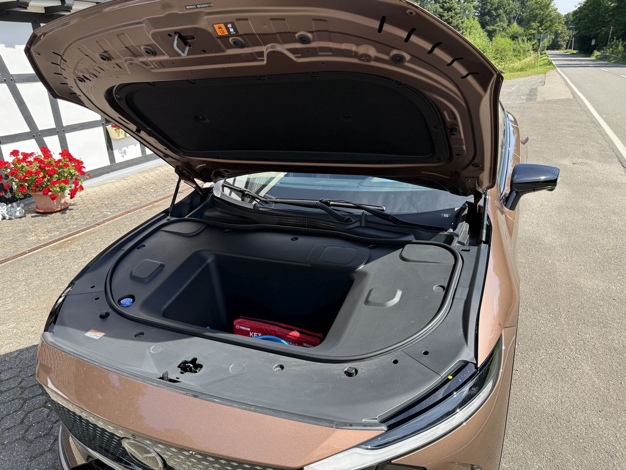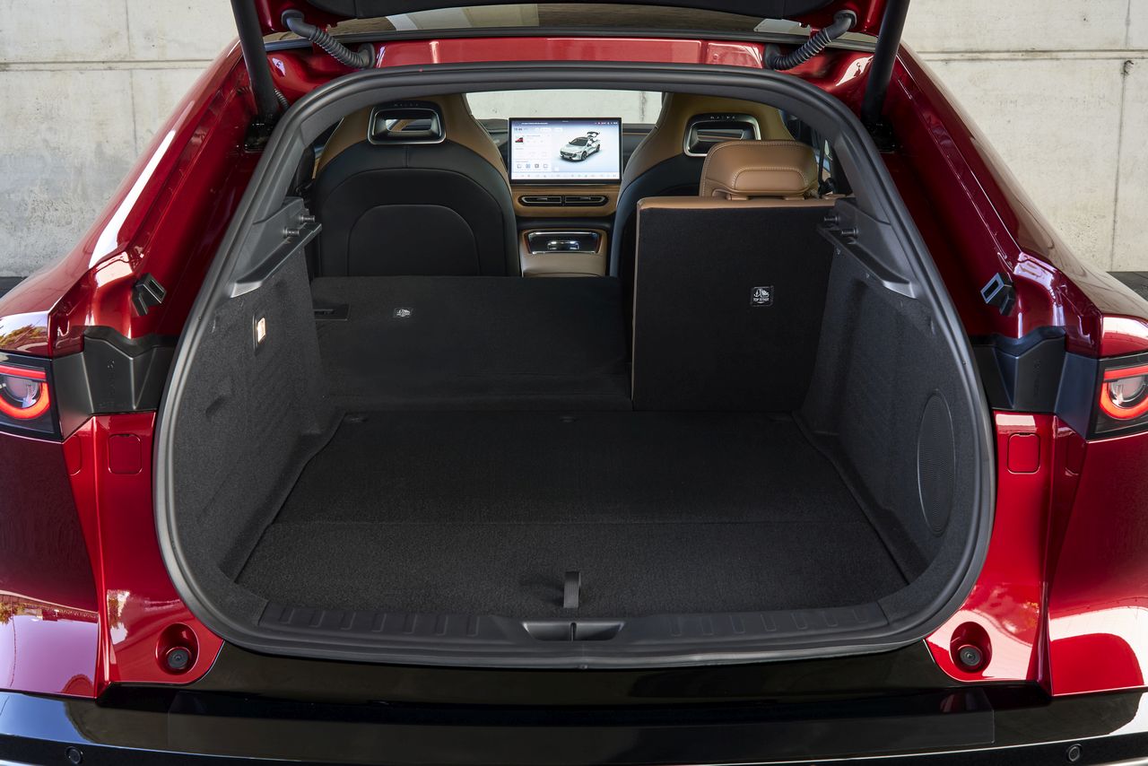 Prtljažnik je sa 336 l poprilično skroman, ali mu u pomoć uskače onaj prednji koji sa 72 l može primiti i omanju torbu uz kablove. Poput mnogih proizvođača, i Mazda se oslanja na ne uvijek intuitivne kapacitivne komande gdje bi od velike pomoći trebalo biti glasovno upravljanje. Potonji sustav još treba proći finu doradu, ali one najosnovnije poput podešavanja temperature ili otvaranja prozora/krova su funkcionirale dobro. Manje dobrim se pokazao softver koji bi, primjerice, usred križanja, umjesto navigacijskih uputa, na 14-inčnom multimedijalnom zaslonu odlučio prikazao pogled s kamera 360 stupnjeva, baš kada trebate odabrati u koju ulicu skrenuti.