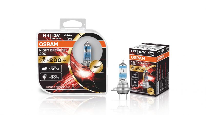 Glavne značajke Osram Night Breaker 200 su: 200 posto više svjetline, 20 posto bjelije svjetlo, do 150 m dugi snop svjetala, kromirani zrcalni vrh žarulje, najsjajnije Osram halogeno svjetlo. Dostupne se verzije H7 i H4 u kutiji i duo boxu.