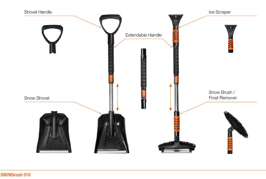 Guste čekinje pomiču teški snijeg, a ojačani strugač sa integriranim sjekačima probija tvrdokorni led bez savijanja ili oštećenja stakla. Za dodatnu svestranost, glave se brzo mijenjaju između alata, a cijeli sustav se rastavlja na pet kompaktnih dijelova za jednostavno spremanje u prtljažniku ili pretincu za rukavice.