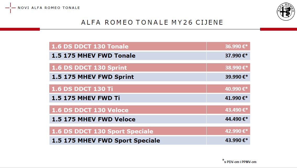 Za pogon su zaduženi 1.6 litreni dizelski motor sa 130 KS, hibridna benzinska verzija sa sistemskom snagom od 175 KS te plug-in model s 270 KS. Početna cijena Alfa Romeo Tonale kreće od 36.990 eura.