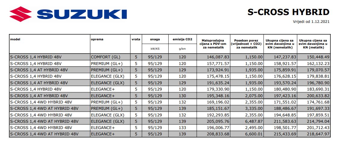 Mnogo toga se ipak promijenilo kod sustava pomoći i udobnosti. Novi Suzuki S-Cross može se, između ostalog, naručiti sa sustavom kamera od 360 stupnjeva, tu je i dodatni tempomat s pomoćnikom u prometnoj gužvi, prepoznavanjem prometnih znakova i asistentom za parkiranje. Osim toga, pametni telefon se može povezati bežično putem Apple Carplaya i Android Auto. Što se cijena tiče, kompletni cjenik možete naći u našoj galeriji fotografija. Novi S-Cross u naše će salone stići početkom prosinca.