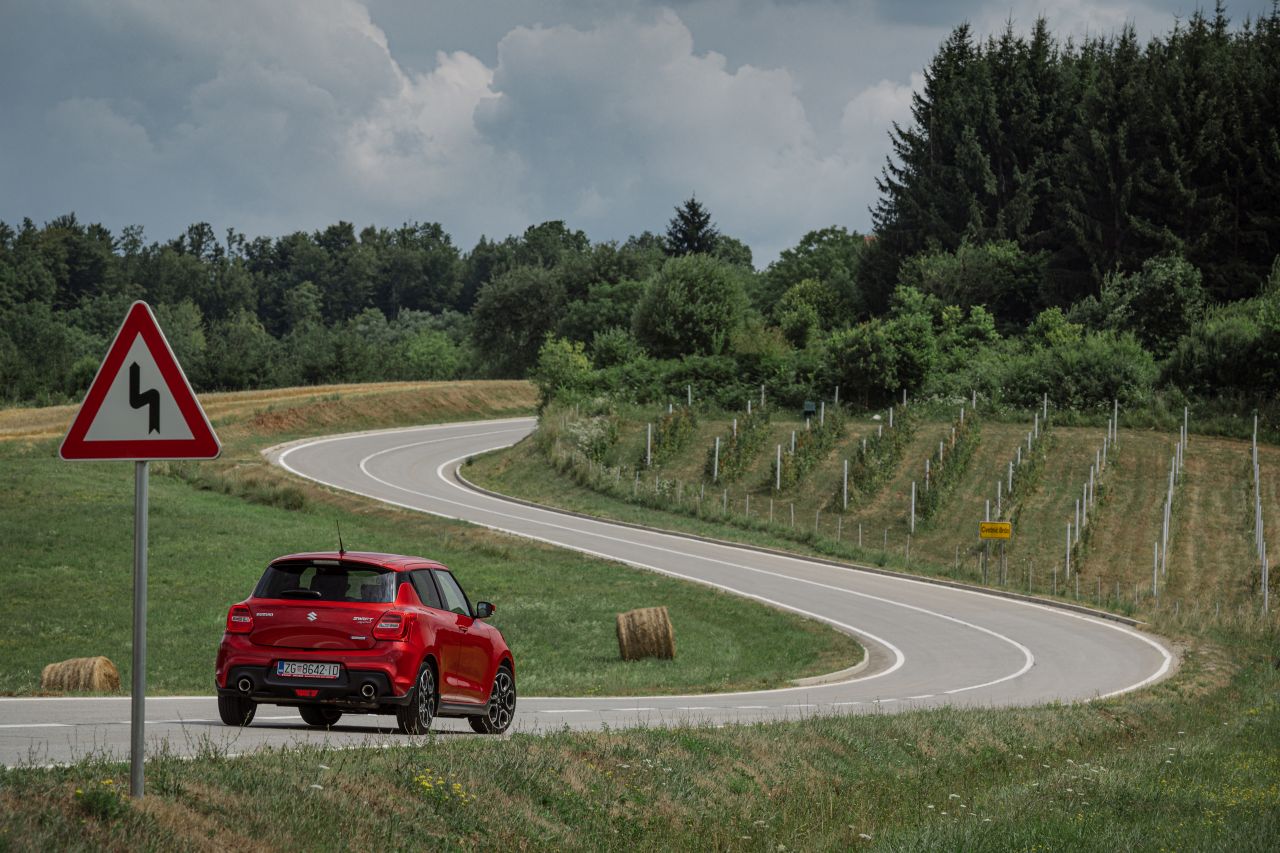 Crveno obrubljeni trokut s crnom vijugavom strelicom na bijeloj pozadini prometni je znak koji službeno označava ‘dvostruki zavoj ili više uzastopnih zavoja od kojih je prvi ulijevo/udesno’, no krajnje pojednostavljeno, zapravo znači jednu od dvije stvari – opasnost ili zabavu. Vaša perspektiva o tome može ovisiti o nizu faktora, poput stanja prometnice, vremenskih uvjeta i, naravno, automobila koji vozite, no ako ste se poput nas, na praznoj, suhoj i dobro održavanoj cesti našli za upravljačem najbržeg Suzukijeva hatchbacka, takav ste znak najvjerojatnije prošli pripremajući idealnu putanju za brzi prolaz nadolazećih zavoja.