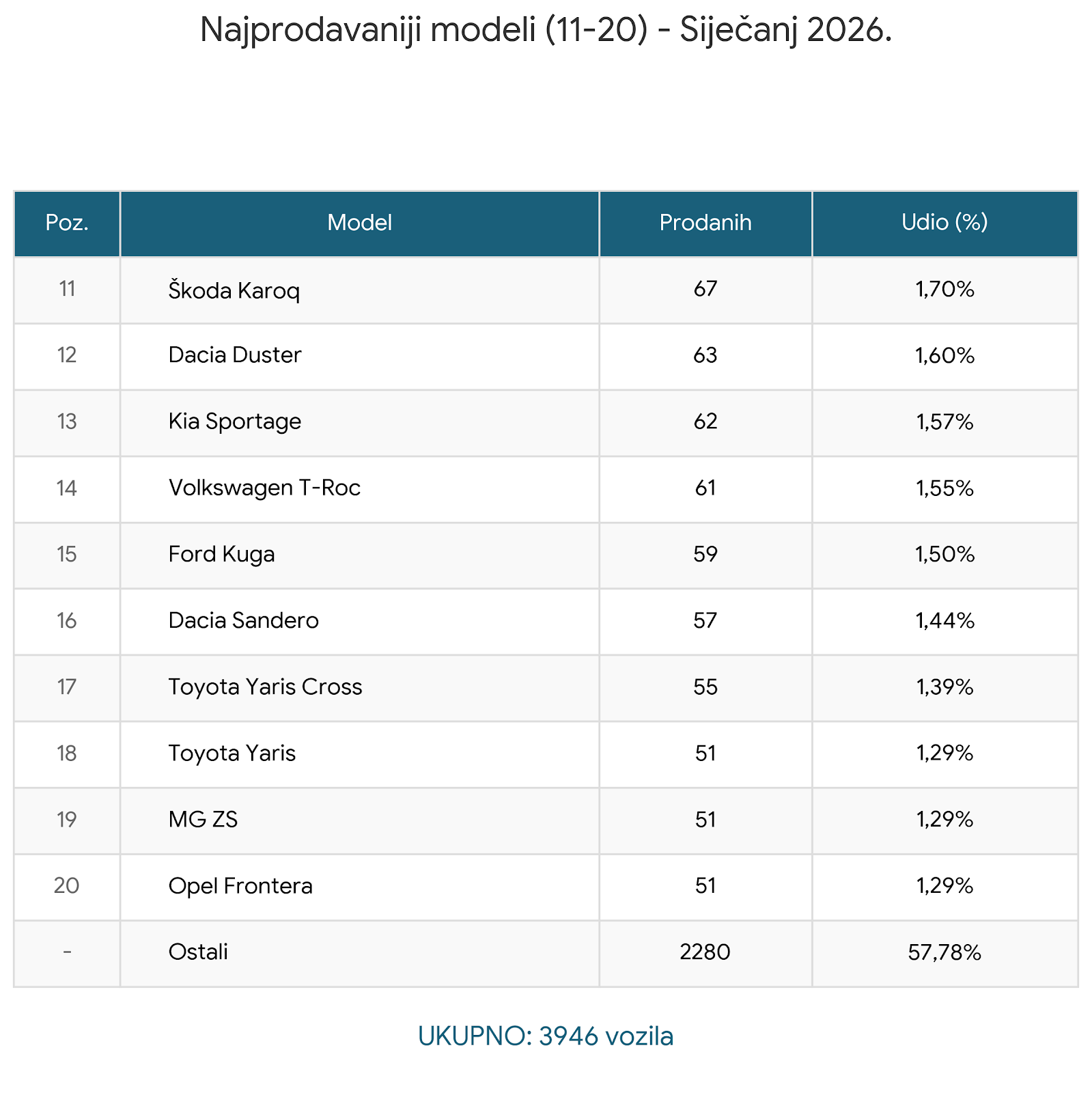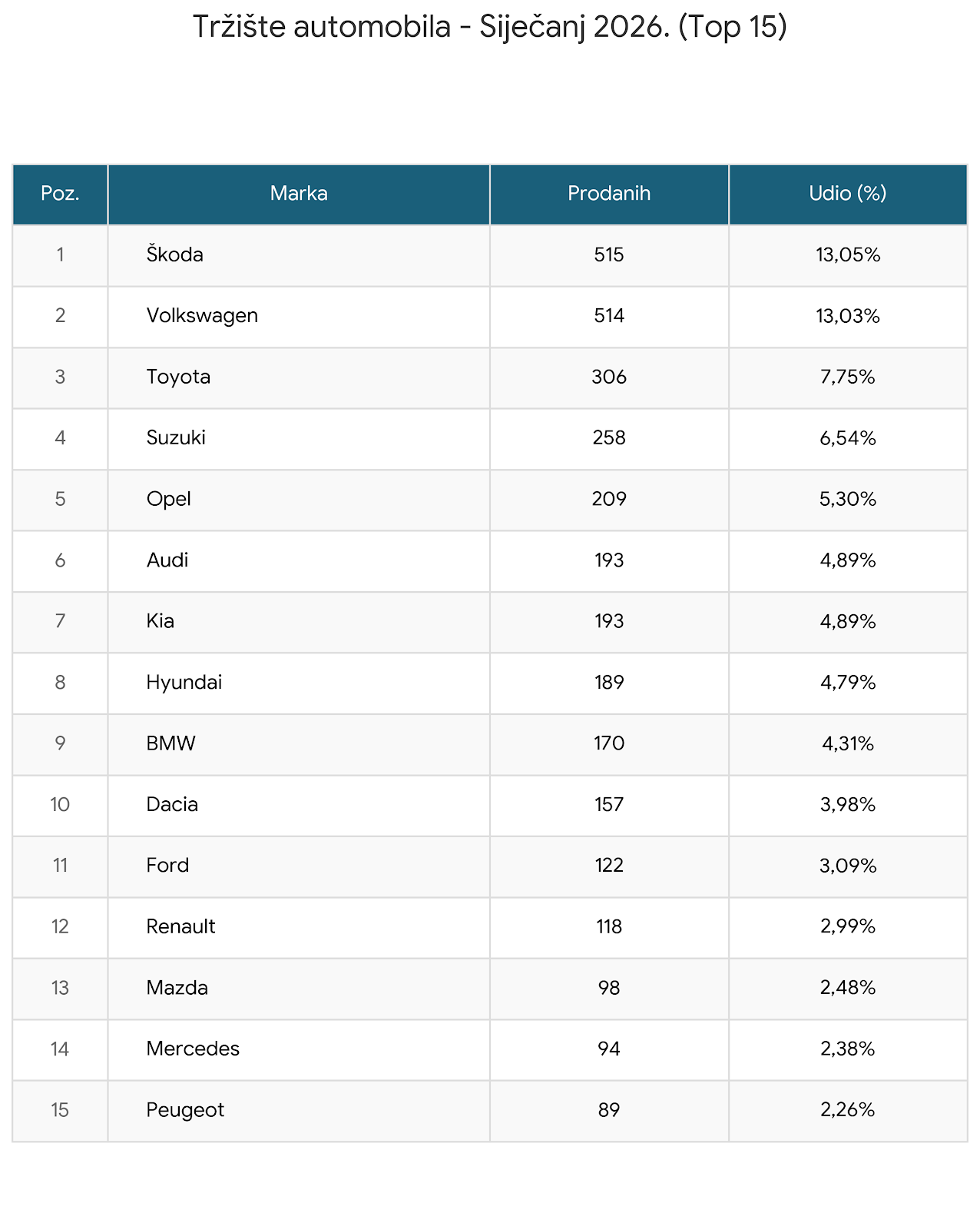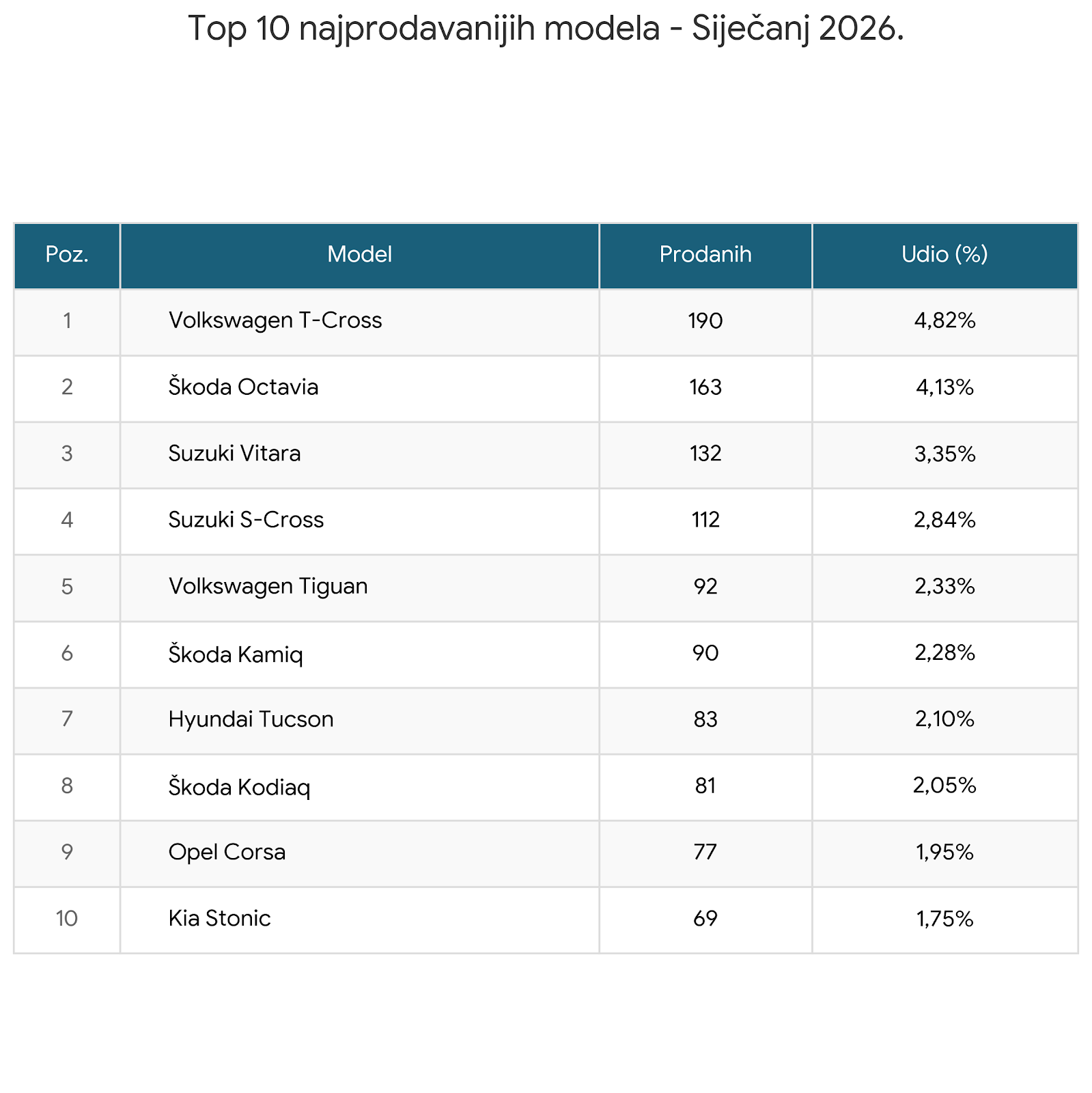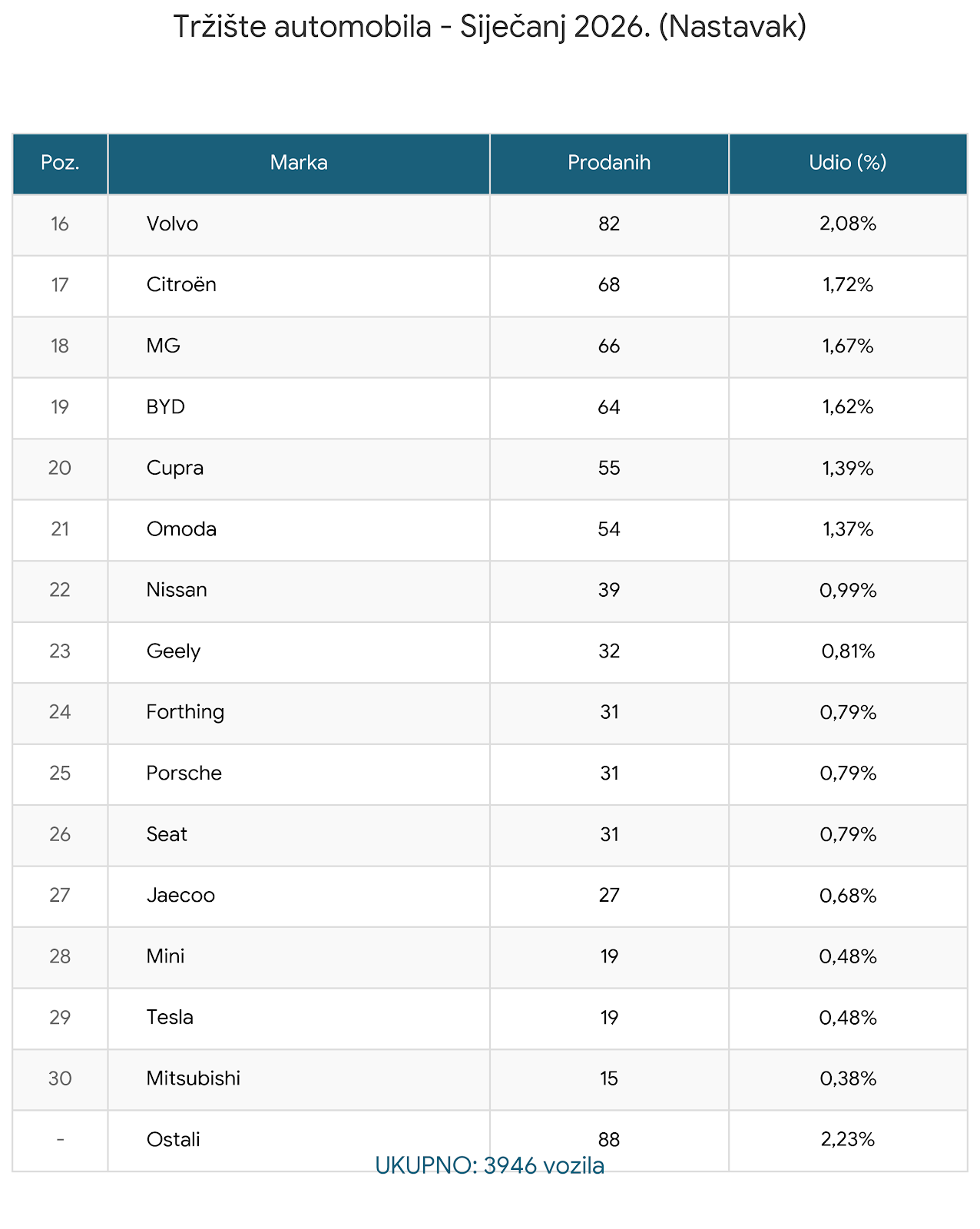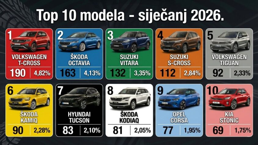 S ukupno 3946 novo registrirana automobila u prvom mjesecu 2026., nova je godina startala dosta slabije nego prethodna – točno za 515 novih automobila slabije.