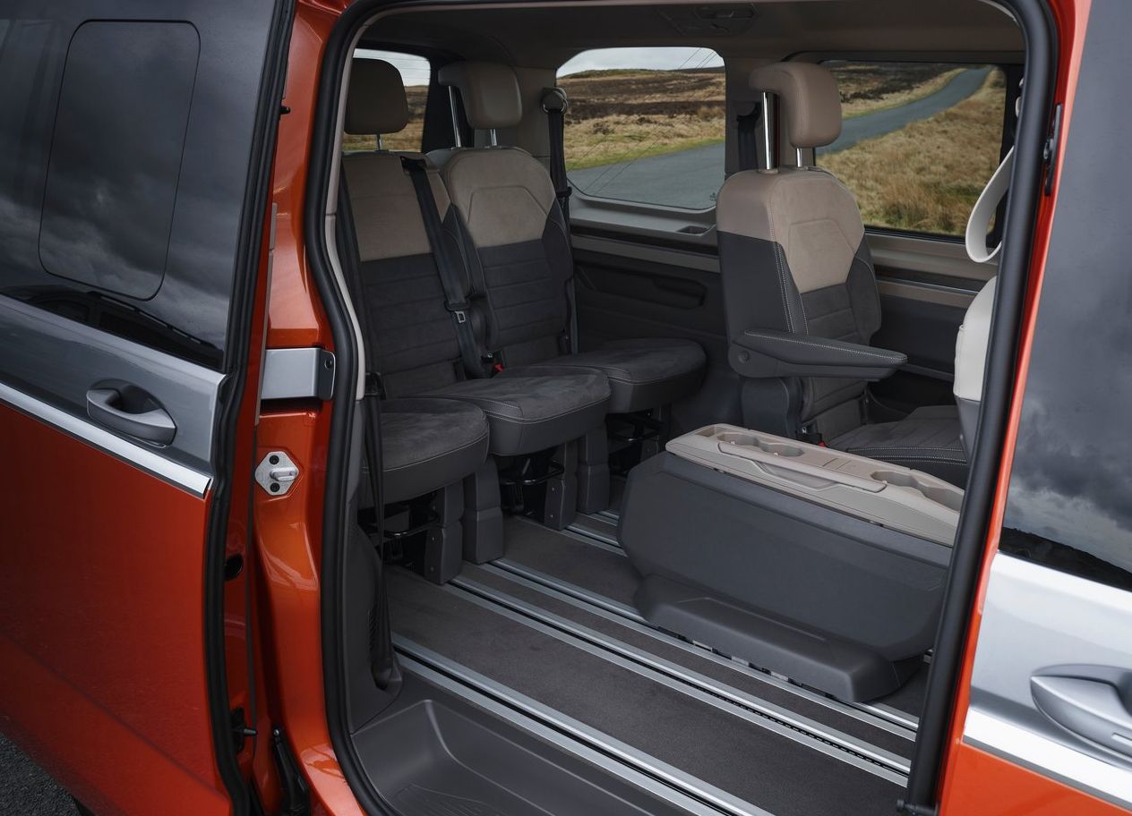 Vrhunski opremljen i nanovo osmišljen Multivan impresionira svojom multifunkcionalnošću i brojim pametnim rješenjima. Rješenjima koja su osmišljena do najsitnijeg detalja: potpuno ravna podnica u prvom redu sjedala, novi, inovativni sustav vodilica i pojedinačna sjedala koja se izrazito lako vade omogućuju raznovrstan raspored sjedala bez velikih napora. A prolaz između prednjih sjedala do putničkog prostora još je udobniji zahvaljujući primjeni elektromehaničke parkirne kočnice.